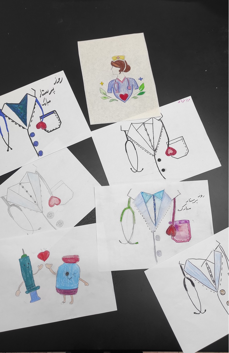 نقاشی های دانش آموزان نجمیه و اهدای آن به والدین پرستار به مناسبت ولادت حضرت زینب کبری (س) و روز پرستار